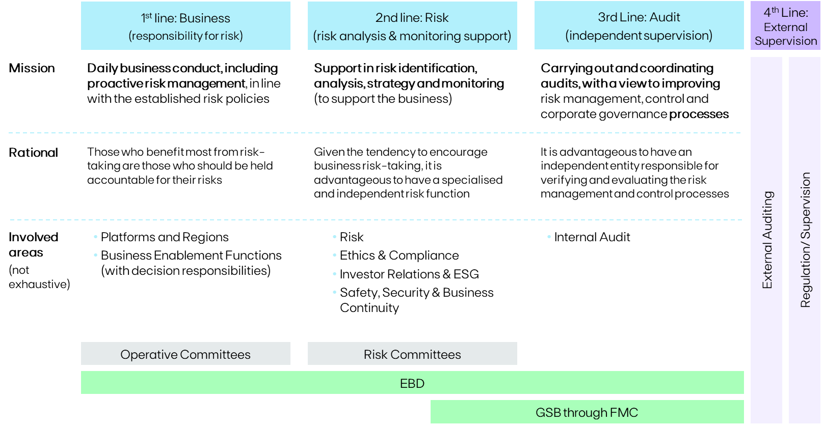 The EDP Group adopts a widely recognized risk governance model based on the three lines of defences, which can be, in certain situations, supplemented by a fourth line through external audit and regulatory supervision . Each line of defence has defined entities and forums at Corporate, Platform, and Regional levels to ensure coordination, avoid overlaps, and promote collaboration.