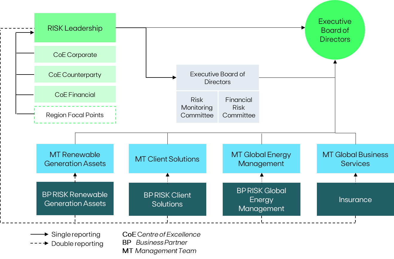 Risk management is embodied by the Risk Business Enablement Function (Risk), encompassed by overarching Centres of Excellence (CoE) and Platform Business Partners (BP), ensuring fluid articulation and communication throughout EDP regarding the main sources of exposure and risk mitigation measures. Additionally, Regional focal points are also defined to ensure an overarching perspective of the risk of each region and serve as a link to the Region organization.