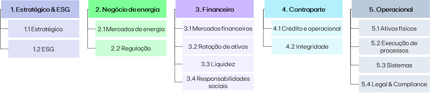 A taxonomia de riscos do Grupo EDP agrega, numa perspetiva integrada e com uma linguagem comum, os vários mapeamentos de risco existentes ao nível das diferentes Plataformas e Regiões do Grupo, e está estruturada em cinco grandes famílias: Estratégicos & ESG, Negócios de Energia, Financeiros, Contraparte e Operacionais.