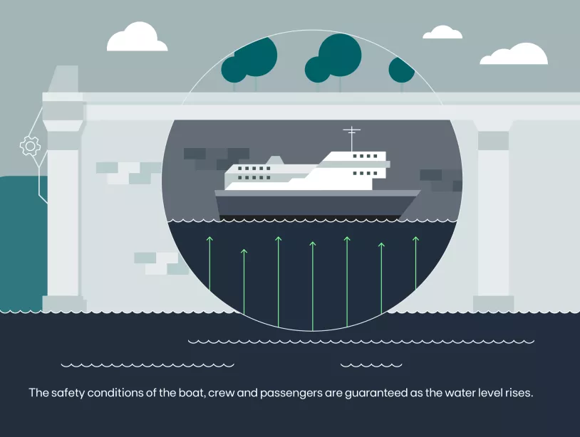 The compartment is progressively filled with water which, like an elevator, takes the vessel to the top of the dam. After this, the "elevator" is opened and the vessel can continue its journey, already in the upstream (therefore, in the highest part) zone of the dam. The reverse route is performed by emptying the sluice.